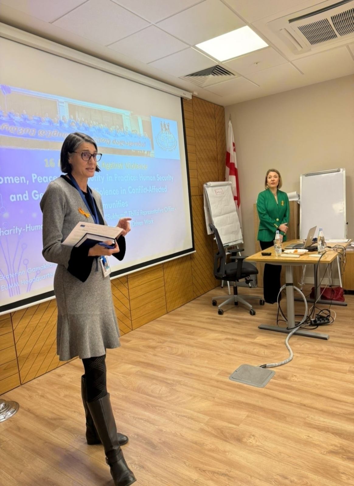 The meeting was held within the framework of the 16 Days of Activism Against Gender-Based Violence campaign. Ekaterine presented the key areas of the organization’s work, recent research findings, and the main security challenges faced by internally displaced and conflict-affected women — including rising social and economic risks, high prevalence of violence, and limited access to support services.