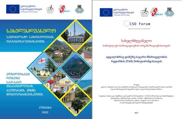 В рамках проекта «Общий форум организаций гражданского общества Гурии, Имерети и Рача-Лечхуми с целью мониторинга дорожной карты Реформы государственного управления» была подготовлена публикация – Методическое пособие для организаций гражданского общества – для мониторинга Реформы государственного управления на местном уровне. В пособии даны тренинговые материалы, которые были использованы в образовательных мероприятиях для целевых организаций гражданского общества.
